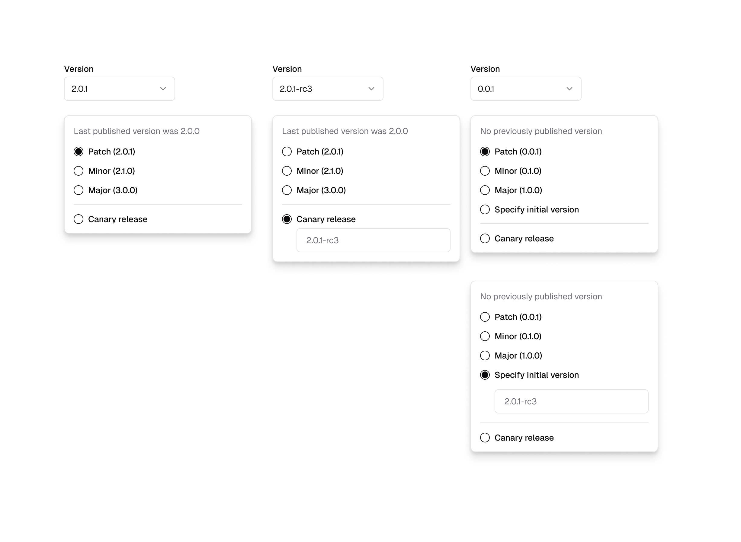 If you haven’t ever published a release, we’ll let you choose your initial version. After that, we’ll increment every time you release - you’ll be able too choose if it’s a Patch, Minor or Major release.